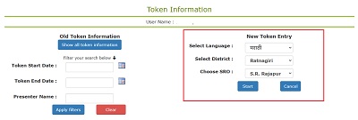 - आता तुमच्यासमोर एक नवीन पेज ओपन होईल त्यामध्ये तुम्हाला New Token Entry या पर्यायाचा वापर करायचा आहे आणि तुमचा जिल्हा तसेच तुमचा SRO याची निवड करून Start बटनावर क्लिक करायचे आहे.